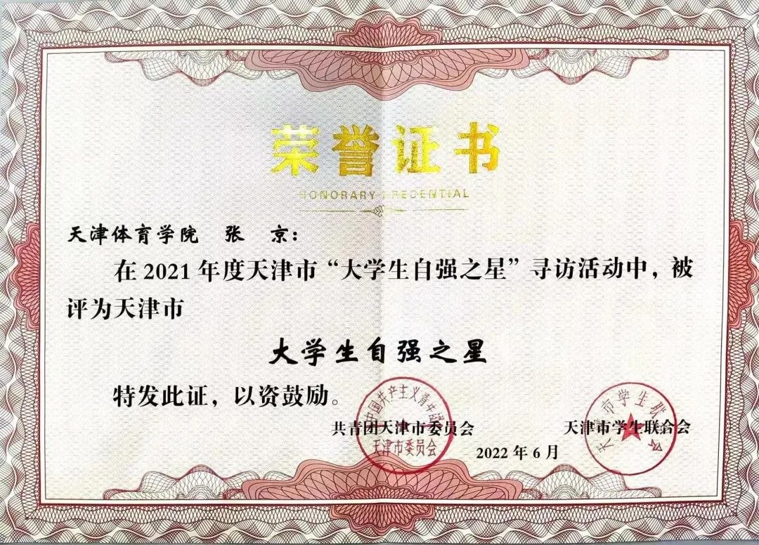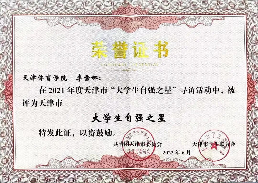 经过院级推荐、校级评审、市级遴选,best365运动训练科学学院2021级硕士研究生张京,体育文化学院2018级本科生李雪娜获得2021年度天津市“大学生自强之星”荣誉称号。