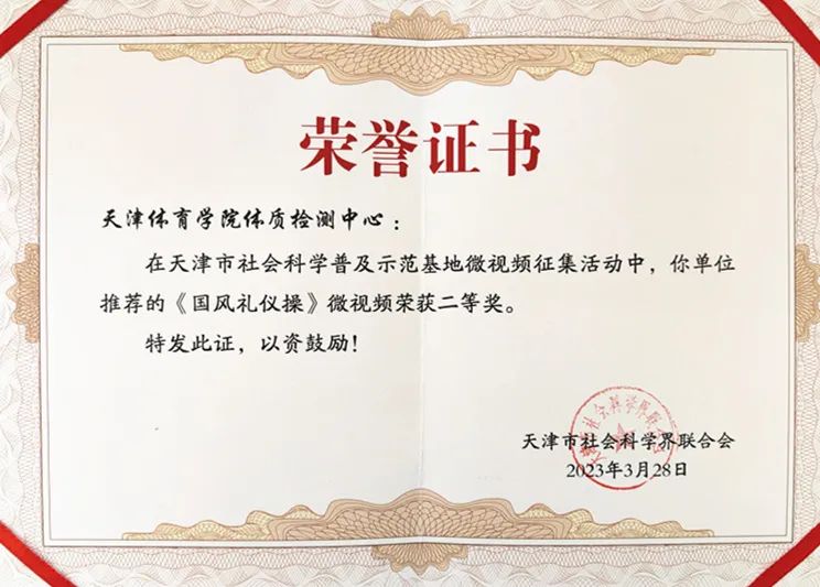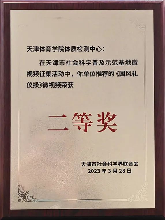 近日,天津市社会科学界联合会组织开展“学习贯彻二十大,踔厉奋发向未来”主题微视频征集活动,best365运动健康学院体质检测中心推荐的微视频作品《国风礼仪操》荣获二等奖。