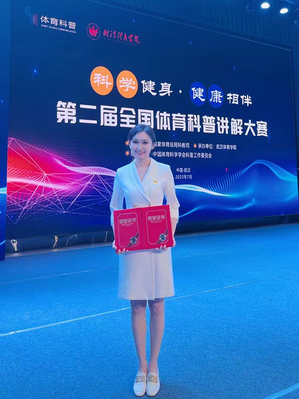 7月21日上午,由国家体育总局科教司主办、武汉体育学院承办、中国体育科学学会科普工作委员会协办的“科学健身、健康相伴”第二届全国体育科普讲解大赛决赛在武汉体育学院举行,共有来自全国体育系统的30名选手入围。best365教师李相宜代表学校参赛,最终荣获二等奖,并荣获“全国体育系统十佳科普讲解员”称号!