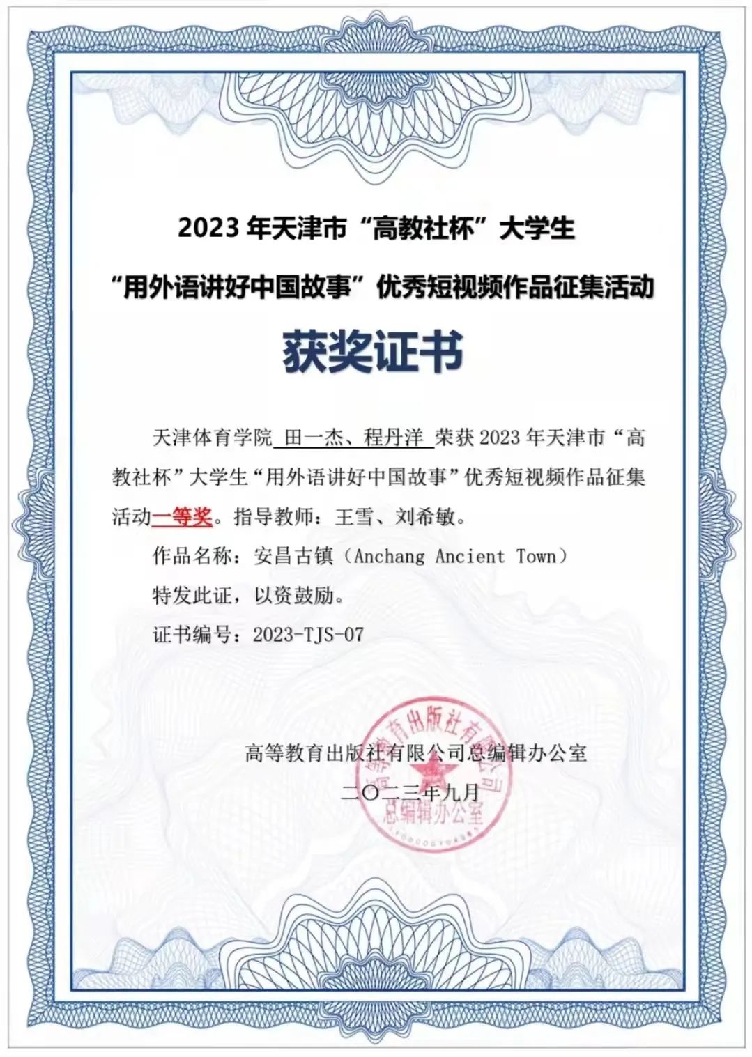2023年天津市“高教社杯”大学生“用外语讲好中国故事”优秀短视频作品征集活动天津市决赛于近日结束。由best365传媒与艺术学院(国际教育学院)国际中文教育与英语教研室王雪、刘希敏老师担任领队,传媒与艺术学院(国际教育学院)英语专业2020级本科生田一杰、程丹洋同学组成的团队制作的短视频作品《Anchang Ancient Town》喜获天津市一等奖,为best365赢得了荣誉!