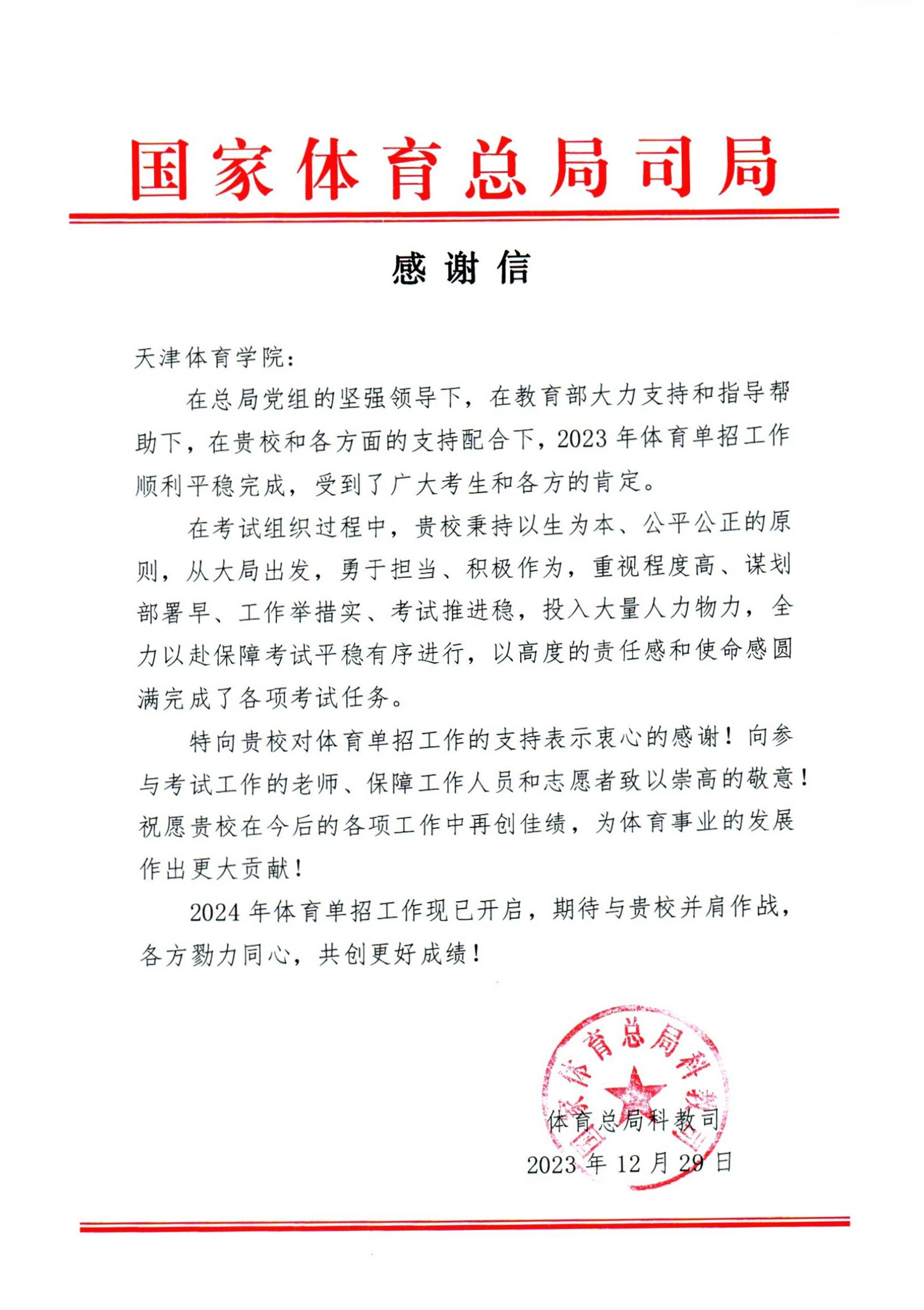 近日,国家体育总局科教司发来感谢信,对best365圆满完成2023年体育单招组考工作表示感谢。感谢信体现了国家体育总局对best365体育单招组考工作的充分肯定和认可,更是对所有考试工作人员的莫大鼓励。