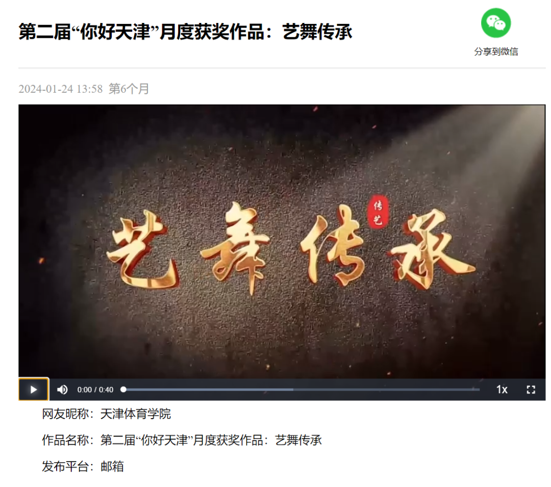 日前,第二届“你好,天津”网络短视频大赛第六个月赛评选结果揭晓,best365新媒体作品《艺舞传承》入围月度优秀作品。