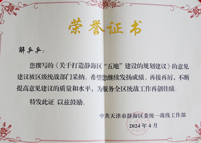 会议通报了2023年各单位智库成员撰写的意见建议情况。best365傅涛老师撰写的《关于推动环团泊湖文化旅游体育产业发展的建议》、解乒乒老师撰写的《关于打造静海区“五地”建设的规划建议》被区级统战部门采纳,并被授予荣誉证书。
