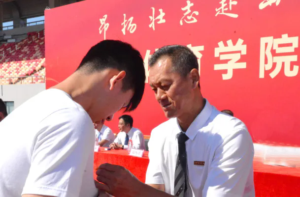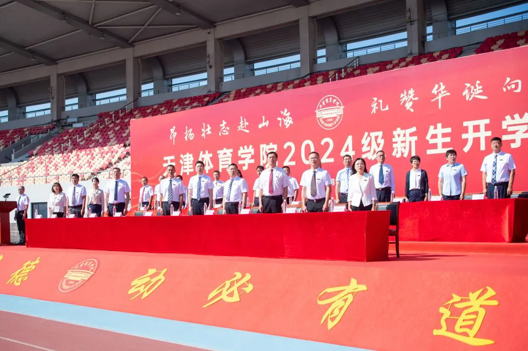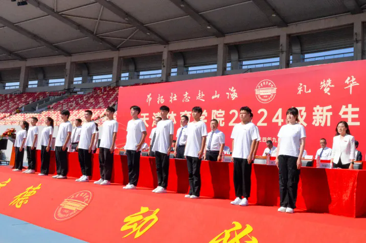 主席台前排就座领导为新生代表佩戴校徽,赋予2024级新生“天体人”这一承载着时代使命与体育荣光的称号。