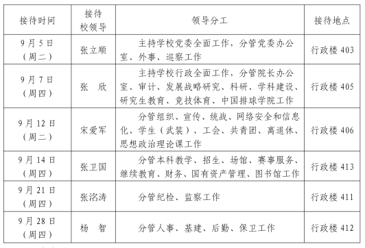根据《best365中国官方网站领导干部接待日制度》规定及学校近期工作安排,现将2023年9月校领导接待师生来访安排通知如下:相关事项: