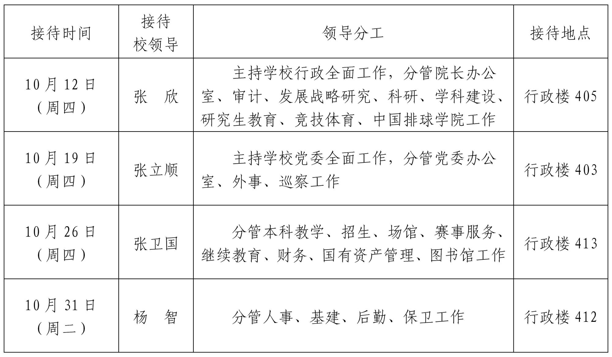 根据《best365中国官方网站领导干部接待日制度》规定及学校近期工作安排,现将2023年10月校领导接待师生来访安排通知如下: