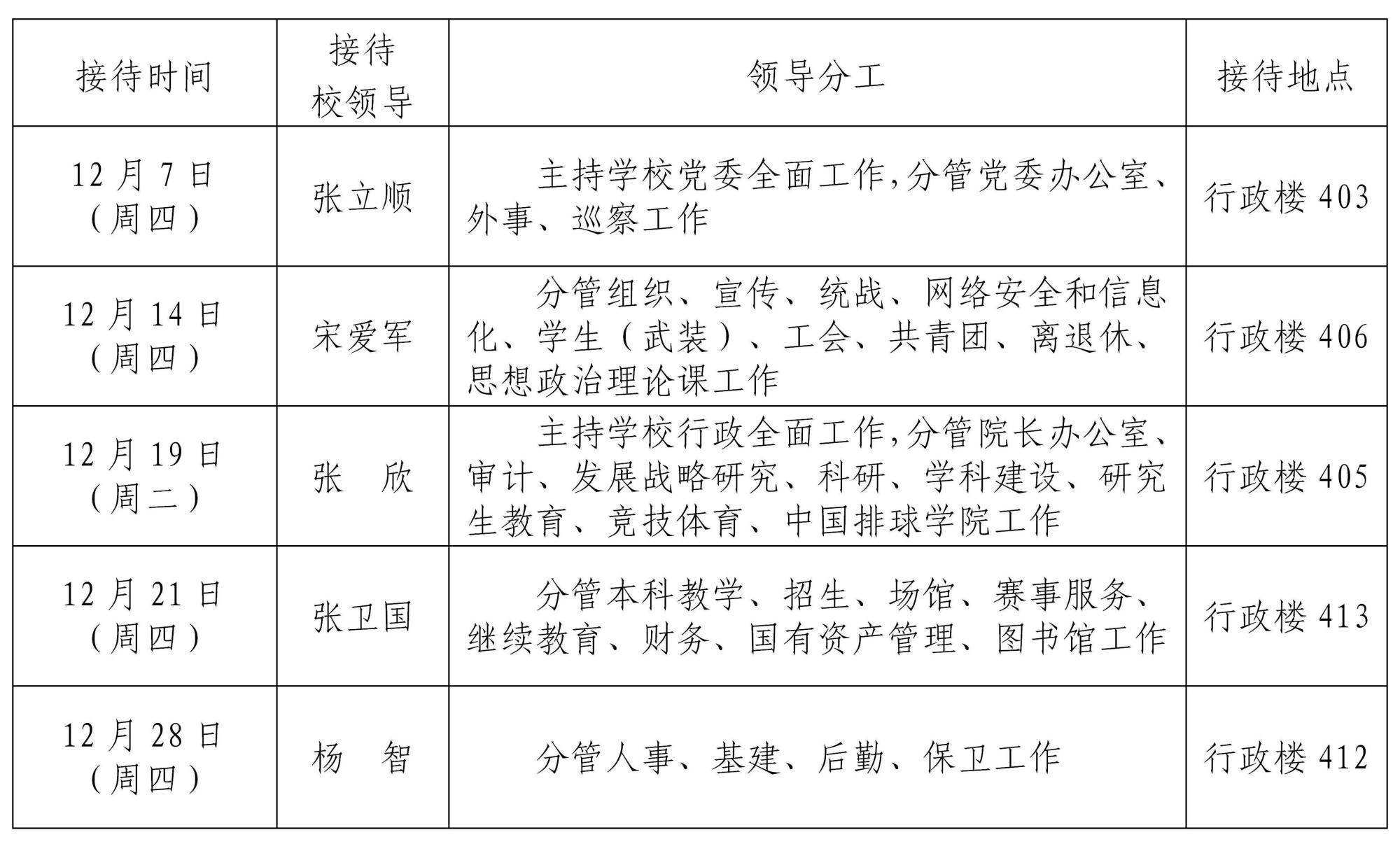 根据《best365中国官方网站领导干部接待日制度》规定及学校近期工作安排,现将2023年12月校领导接待师生来访安排通知如下: