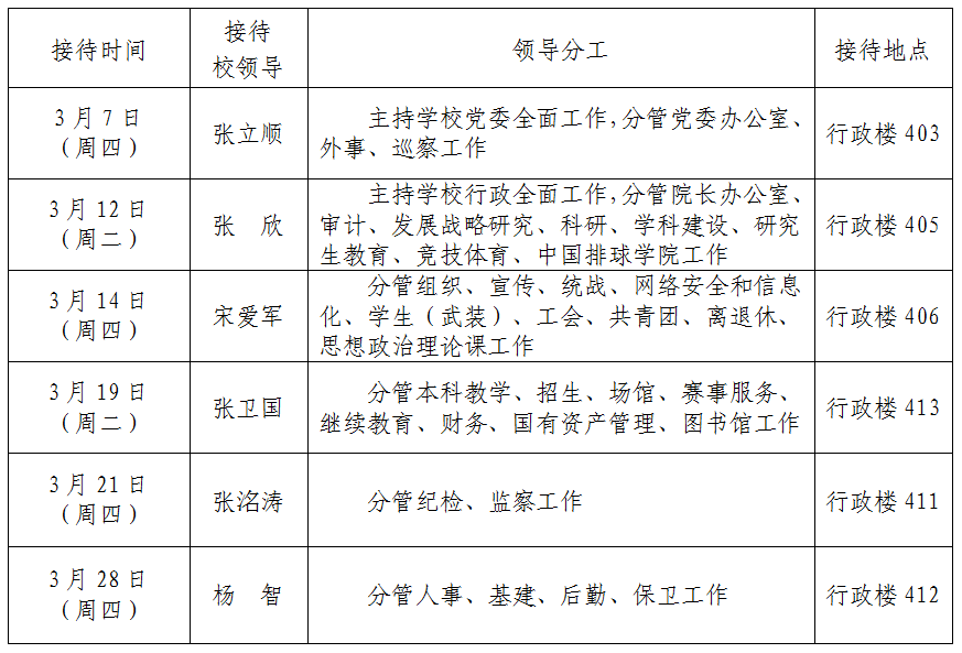 根据《best365中国官方网站领导干部接待日制度》规定及学校近期工作安排,现将2024年3月校领导接待师生来访安排通知如下: